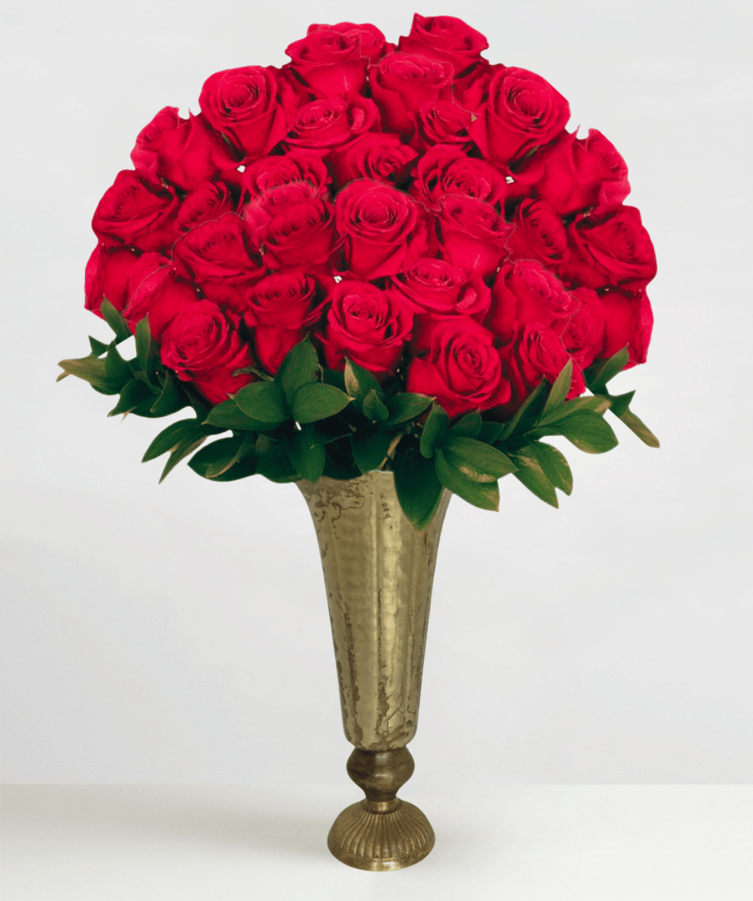 A surprise of the most stunning kind! Fifty of our luxury red roses in a most striking shade of red will arrive to fill the home or office of someone special in your life. Lovely displayed the luxurious bouquet in our silver aluminum vessel.
