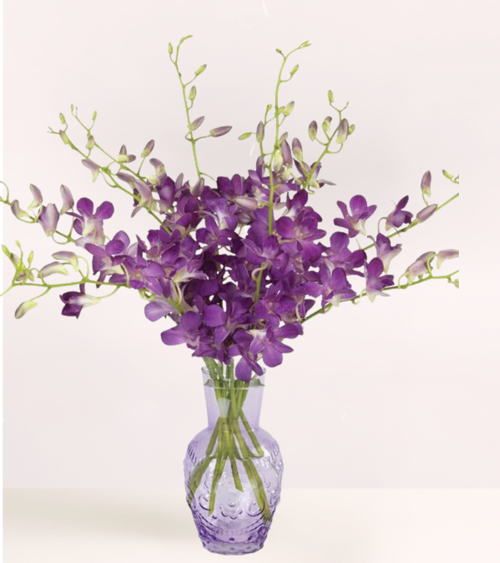 Laden with dozens of silky petals that climb nearly the full length of their stately stalks, dendrobium orchids in any color are always eye catching. But when their hue is as vibrant as this variety, the show is even more impressive. Their purple color gives them an amazing amethyst appearance perfectly complemented by lavender flourish glass vase.