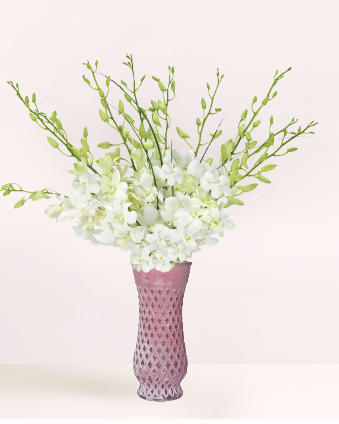 A magnificent look to add a bit of natural elegance to any room of the home, luxurious white dendrobiums. Placed in our textured artisan vase, the lengthy stems fan out in a sensational show of silky white petals. This bouquet has an exceptionally long vase life and makes a fantastic gift or marvelous, mood-setting centerpiece for an autumn party.
