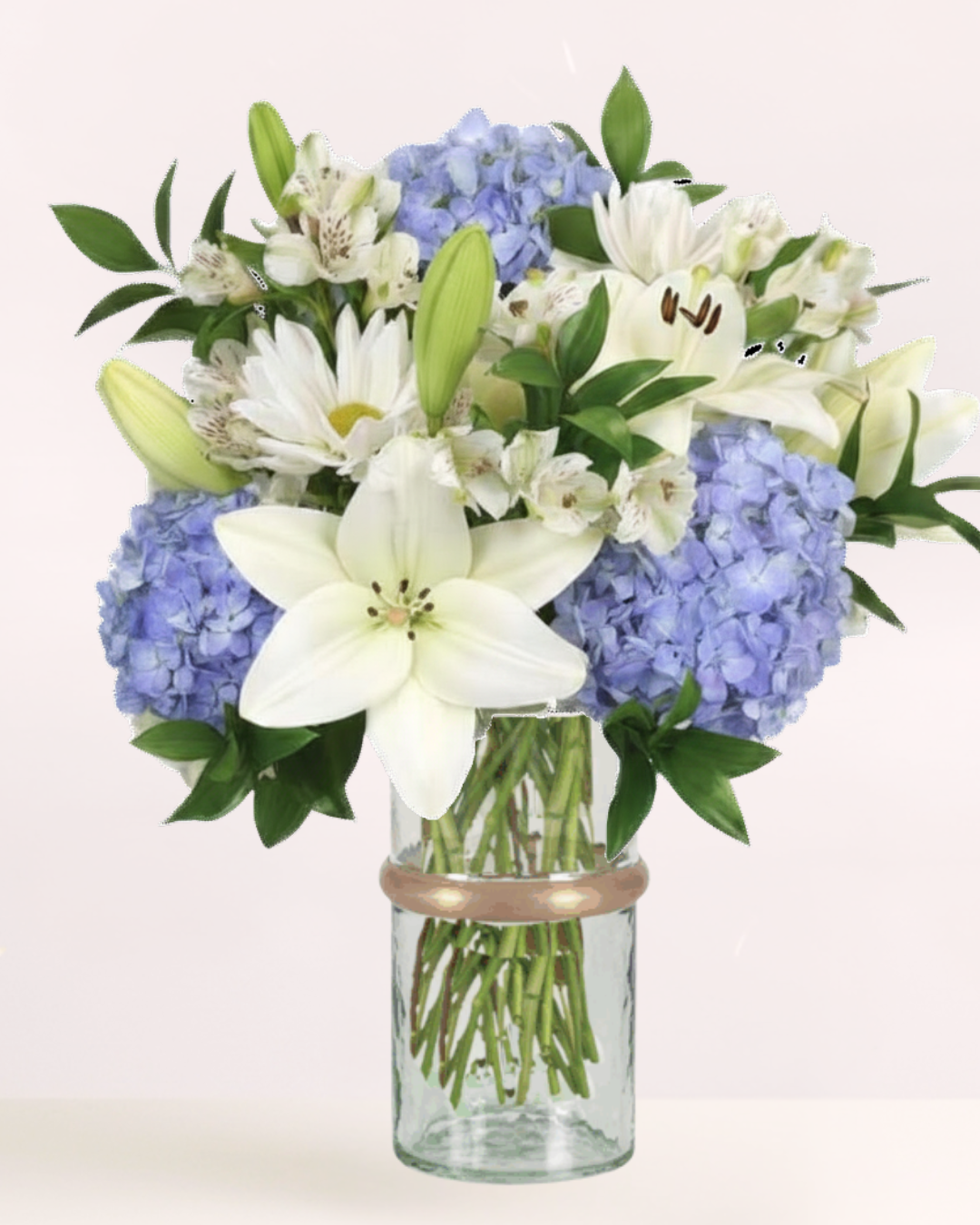 In celebration of summer warmth, we’ve combined billowy blue hydrangea blossoms, creamy white Asiatic lilies, white alstromeria with streaks of burgundy and white pom daisies against a backdrop of dark green ruscus leaves. The bouquet has a very natural appeal when allowed to spread out in our colbalt blue glass vase.