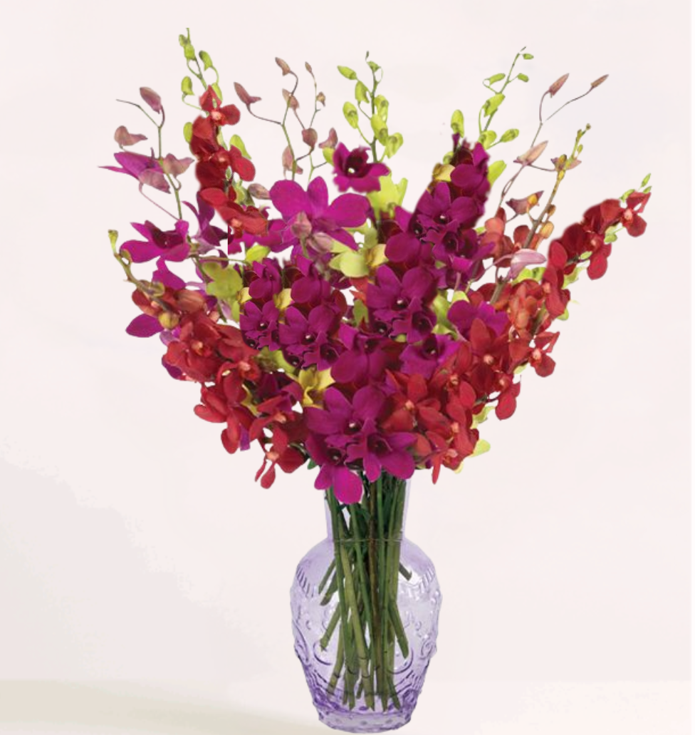 Three varieties of exotic orchids sent straight from our grower in Thailand send your wishes in a fashion that just doesn’t get any finer. Red mokaras & Purple Sabin orchids fan out in a colorful celebration, standing tall in our silver metal urn. Truly a sight to be seen and enjoyed.