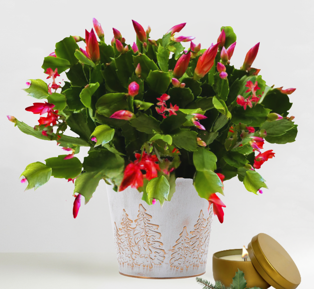 Christmas Cactus: Our most successful flowering plant for beginners! Years and years of growth, generations of enjoyment! This seasonal succulent makes a unique and spirited holiday surprise for any recipient or business associate. It flourishes in any location and often produces more than its namesake mid-winter bloom twice a year. The plant arrives in tight buds and blooms soon after, beautifully packaged in a forest scene-adorned metal cachepot.