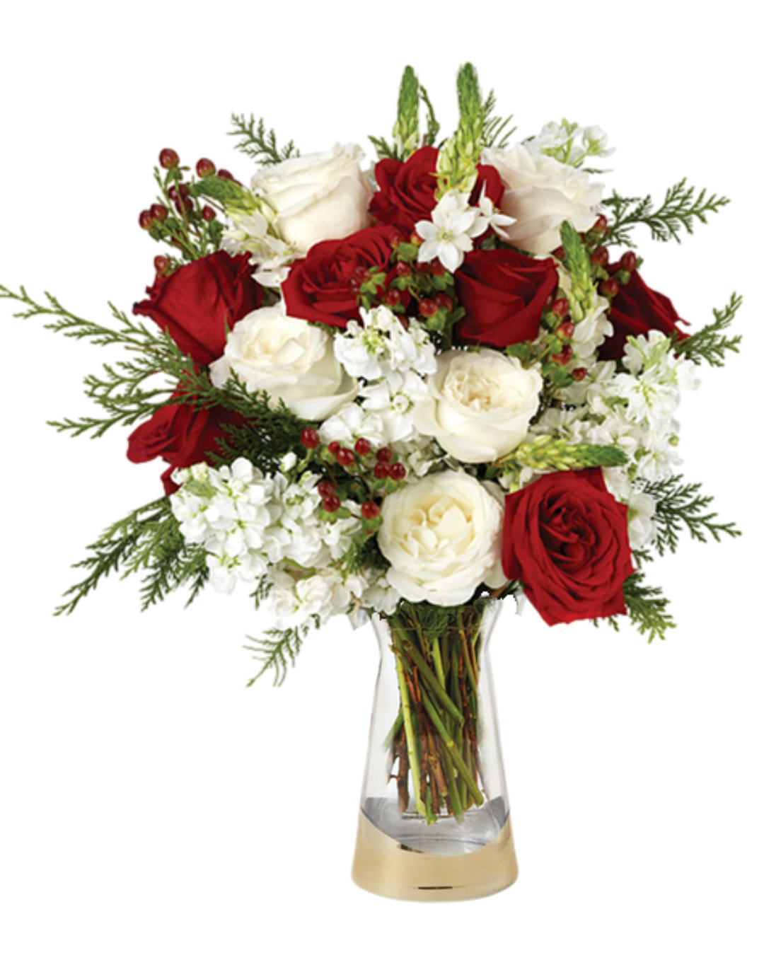 At this time of year when we hold tradition especially dear, there will always be a place in our homes and hearts for a classical red, green, and white Christmas bouquet such as this one. Sweetly fragrant and beautifully presented in our silver translucent vase, it’s designed to hold center stage at any gathering, whether formal or casual.