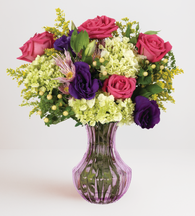Purple lisianthus, mini hydrangeas, chrysanthemums, pink roses, jade trachelium, yellow solidago, mini hydrangea and hypericum berries make the delightful display even fuller. Pretty springtime blooms is beautifully displayed in our vibrant reflective green vase, creating quite a charming surprise perfect for Easter gift-giving. Also, a sweet surprise for a spring birthday or other occasion.