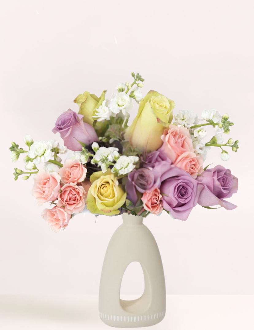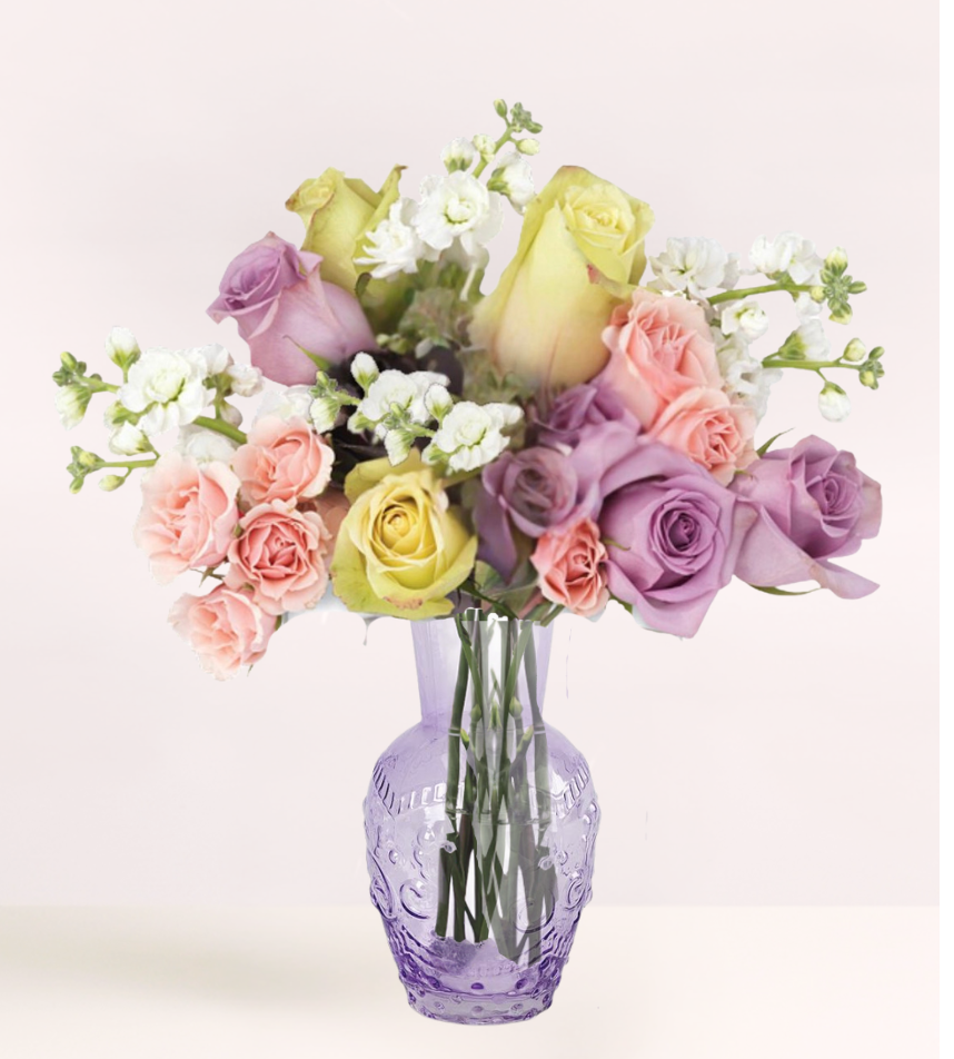 Roses, light green Jade roses, and lavender roses together with fragrant white stock to celebrate the season, flaunting its chic style in one of our vases. Add a touch of elegance to their spring décor or yours with this sophisticated bouquet of seasonal surprises.