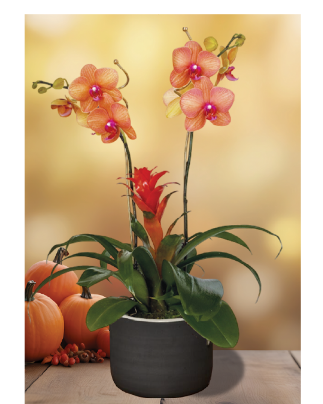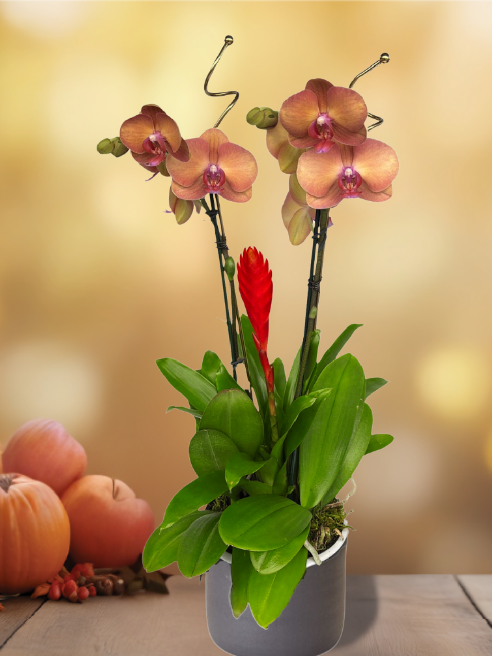 Send our Tropical Garden, featuring two phalaenopsis orchids and a red bromeliad for the ultimate tropical arrangement. In a brown-handled ceramic cachepot, it’s an attractive choice for both men and women and matches all home décor. Shipped when the orchid is in bud-and-bloom for an impressive, long-lasting show.