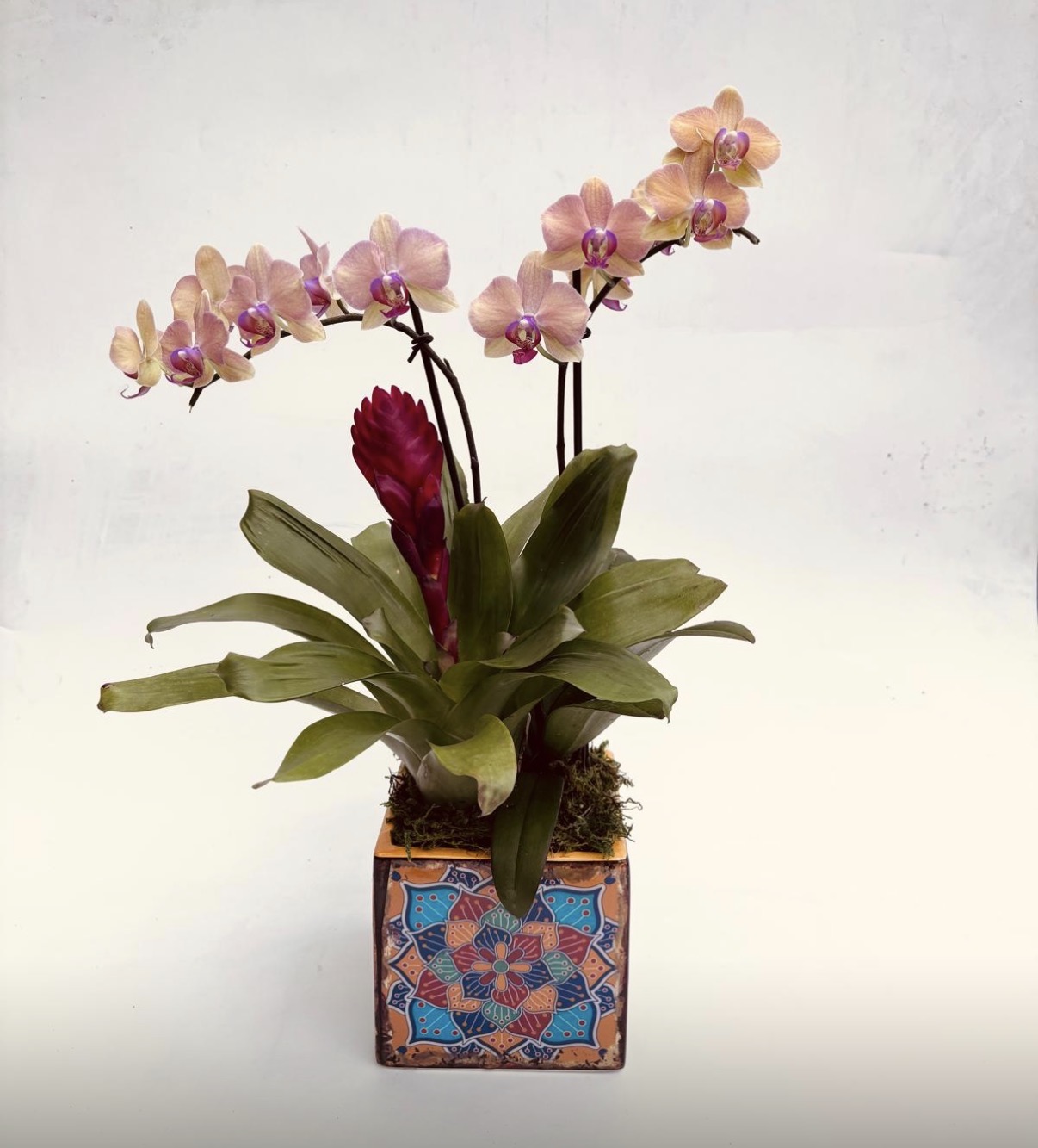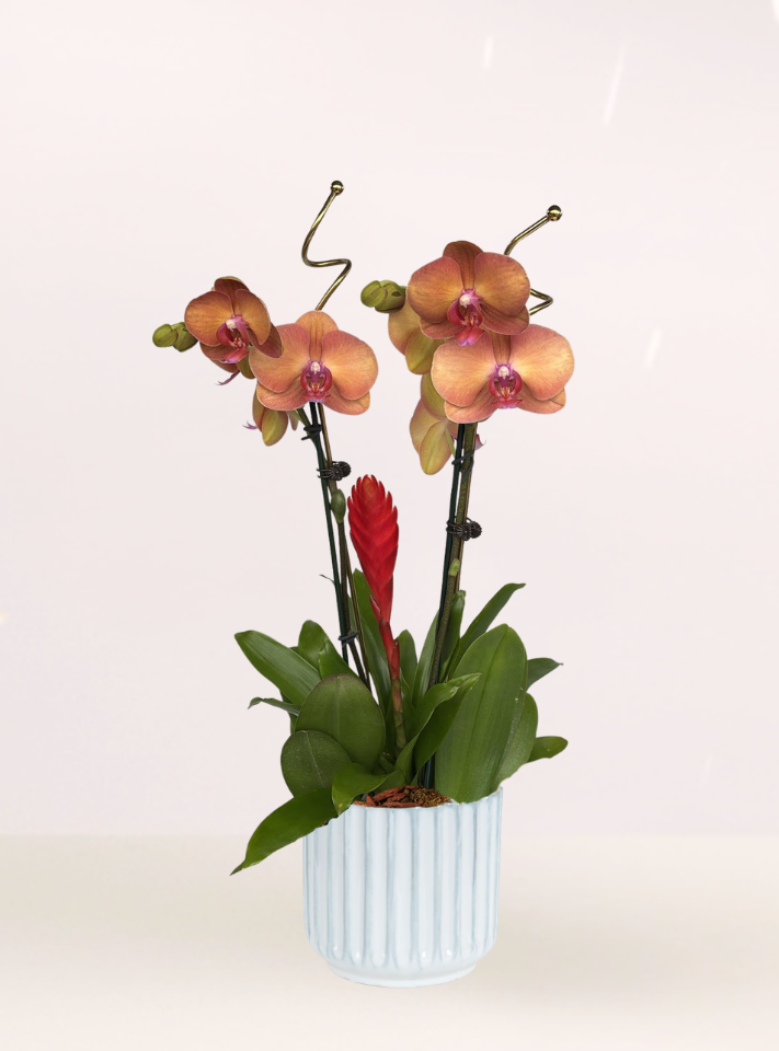 Send our Tropical Garden, featuring two phalaenopsis orchids and a red bromeliad for the ultimate tropical arrangement. In two options for ceramic cachepot, it’s an outstanding choice. Shipped when the orchid is in bud-and-bloom for an impressive, long-lasting show.