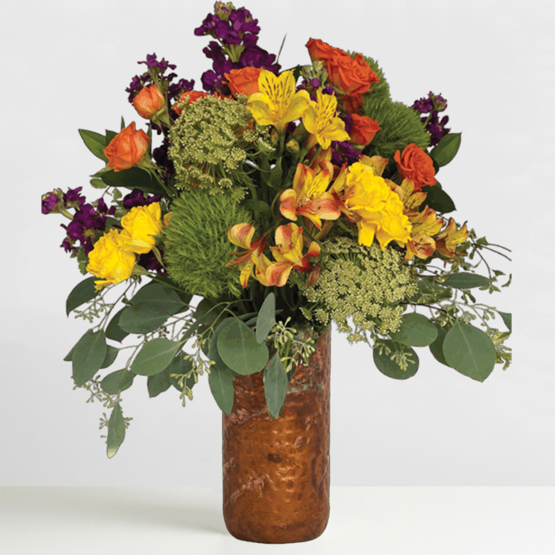 This arrangement features a rich palette of deep greens, earthy browns, and fiery tones—like burnt orange, crimson, and golden amber. It’s both wild and refined, rustic yet luxurious.