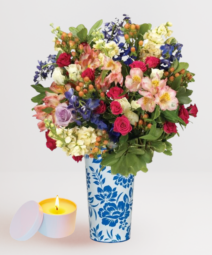 Colorful and artfully designed for the times you want to go completely over the top. Pulitzer-inspired palette and frilly texture are given full attention when displayed in our ceramic keepsake vase. Bouquet made of decadent flowers, ocean Song lavender roses, pink carnations, fluffy alstroemeria, Euroblue delphiniums, creamy blooms, variegated pittosporum