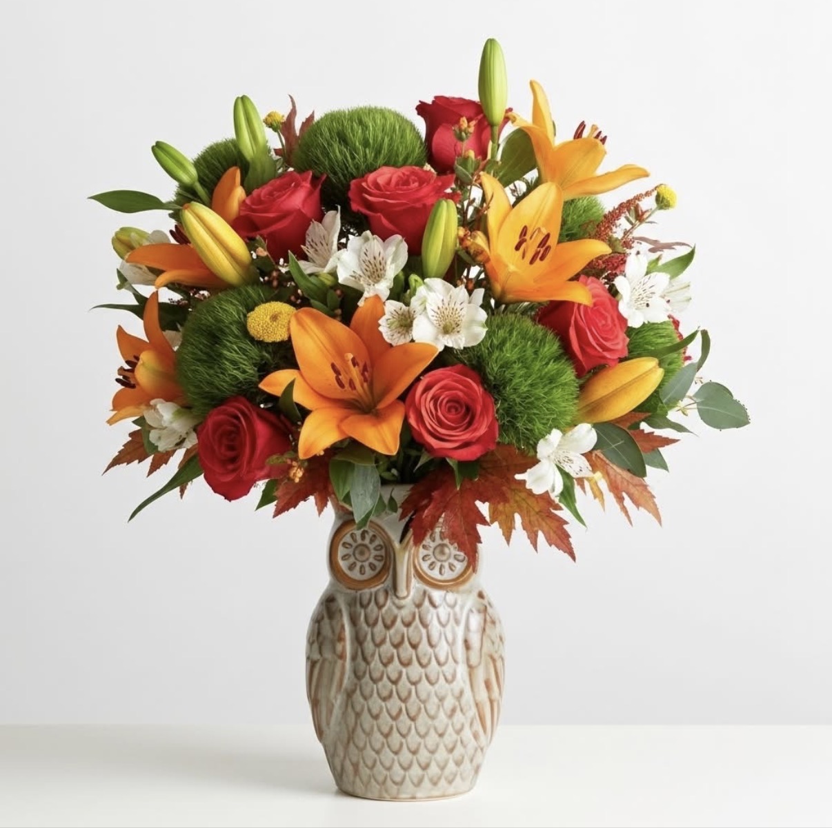 Artisan Owl ceramic vase & fall-inspired bouquet is designed to take you straight to the woods with the calming sounds of owls and nature! Fostering relationships, honored and showing you care. Orange Asiatic lilies, white alstroemeria, Hot Princess pink roses and Green Trick dianthus commingle in our Owl ceramic vase.