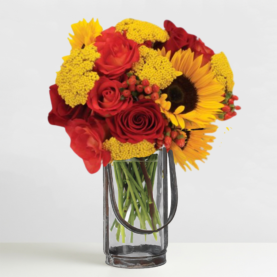 Rich golden hues and gorgeous blooms are sure to enliven every special occasion…from Thanksgiving and special occasions. Bursting with the splendor of bright yellow-orange sunflowers and sunshiny yarrow, the bouquet also features ravishing Red roses, cheery red hypericum berries, and still more roses. You may also keep the stems longer for a more spaced bouquet look (see photos).