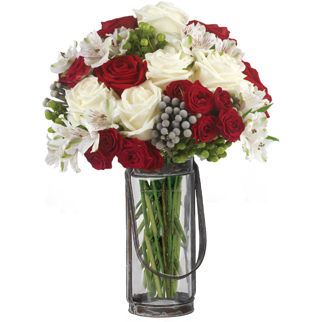 - Silver Brunia may be substituted for added green or red berries. Top Seller! As magical as the season itself, this stunning bouquet uses traditional holiday colors to achieve an effect far from traditional in its sophistication. Both men and women will be enchanted by the fantastical flowers’ beauty, a combination of velvety red and white roses, Silver Brunia, red Brilliant Star spray roses, white Peruvian lilies and rich green hypericum berries all beautifully displayed in our frosted cylinder vase.