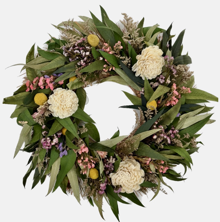Inspired by the quintessential aesthetic that defines the exquisitely manicured gardens. Handcrafted in the USA using preserved leaves, natural Gardenias, pink larkspur, green and leaf-green yarrow, lime-green myrtle and red celosia. Natural twig frame. Finished with a refined burlap bow.