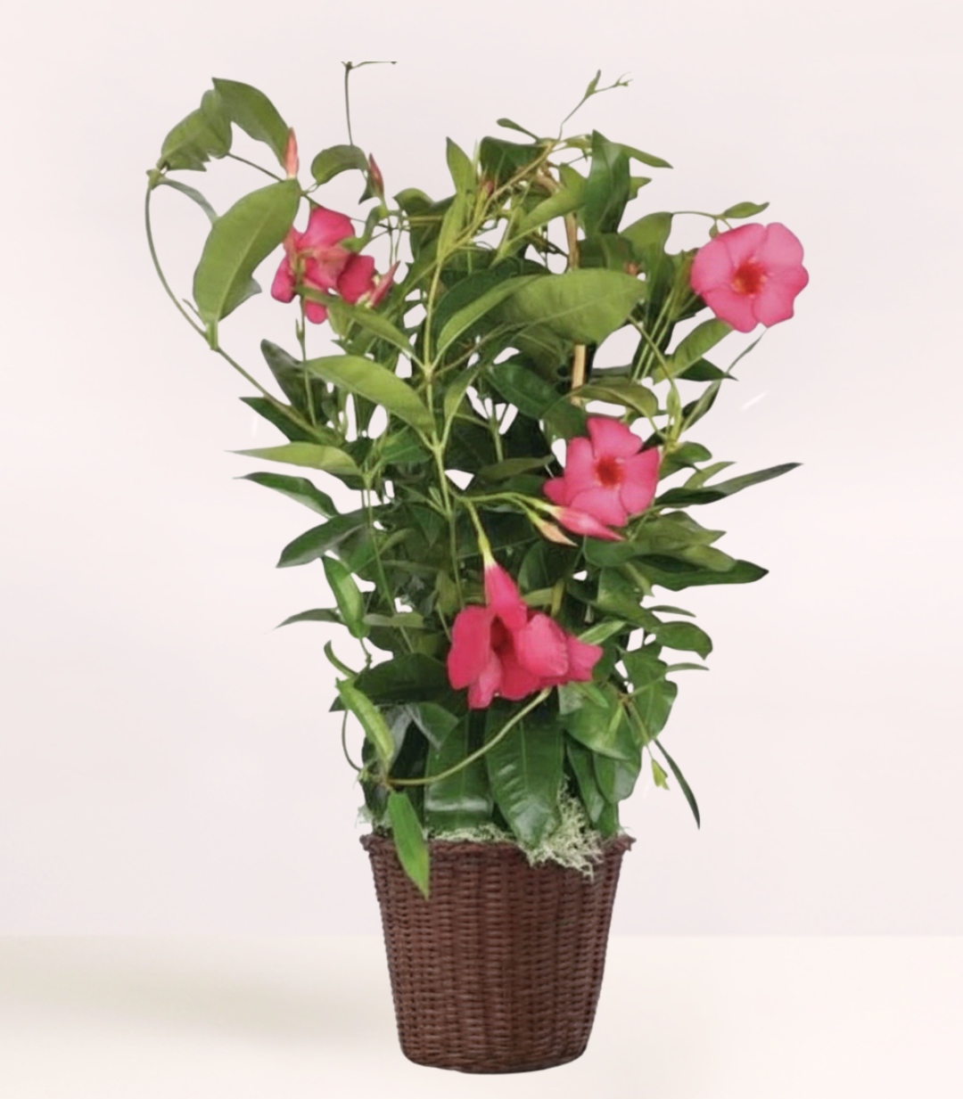 Upon arrival, your plant will be thirsty. Please cut off any spent blooms. Then remove the plant and inner pot from the basket or vessel. SOAK with water gently the entire plant until it drains from the bottom into the sink. Also, gently spray all the leaves and ther buds. Let the plant sit in the skin for an hour. Then repeat the process one more time. Keep the soil evenly moist, but do not have sitting water in or around the plant. (While it flowers, you will need to add water every day to moisten the soil- not soak. Mandevilla vines need some shade. They enjoy bright, indirect light or filtered sunlight, but can get burned in direct, full sunlight. In order to get the best mandevilla flowers throughout the summer, give your mandevilla plant a high phosphorus, water soluble fertilizer once every two week. Also pinch your mandevilla. This method of pruning your mandevilla will create a bushier and fuller plant.
