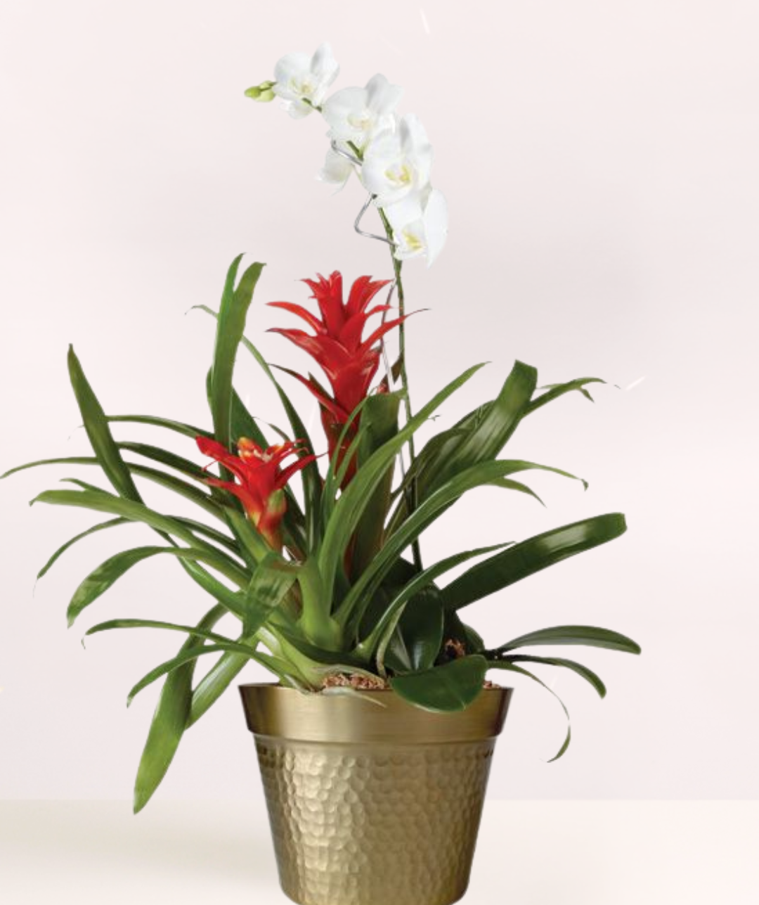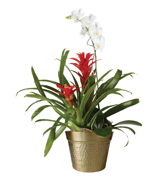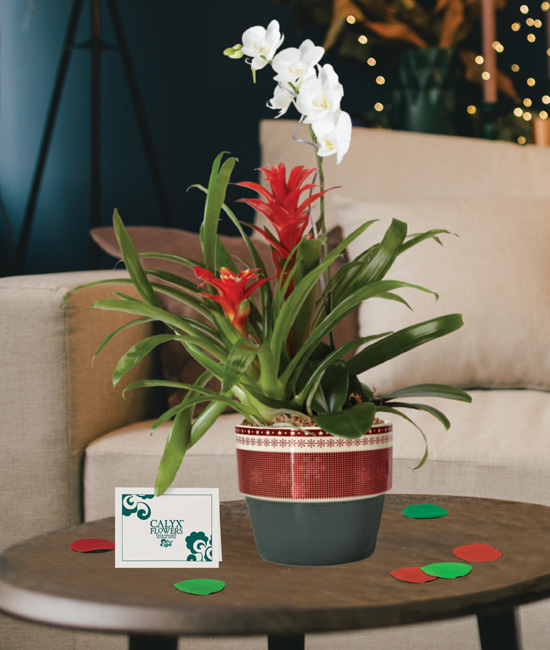 A gift made surprisingly easy yet exceptional, this garden is indeed miraculous. The hearty bromeliad (red or yellow) and orchid plant treat your recipient to a new view each day. With proper care, the show will continue for months to come.