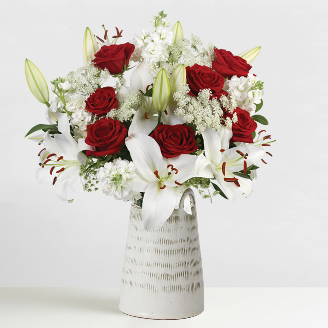 Center of attention. With a showy mix of white Oriental lilies (arrives in buds and will bloom), red Freedom roses, white double bloom stock, Queen Anne’s Lace and green pittosporum; this fashionable, fragrant bouquet instantly refreshes living and business spaces. The classic and elegant ceramic vase is perfectly suited for a mixed Holiday bouquet.