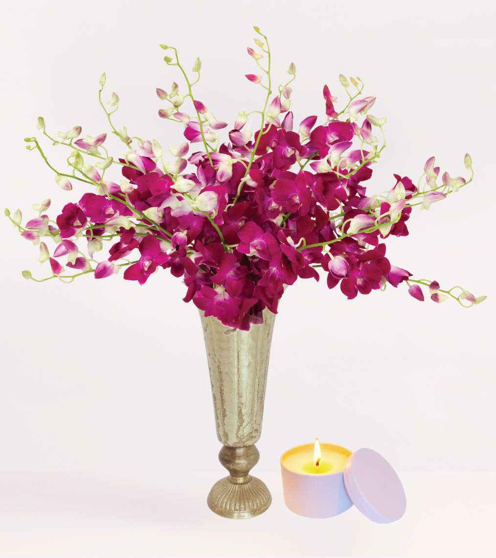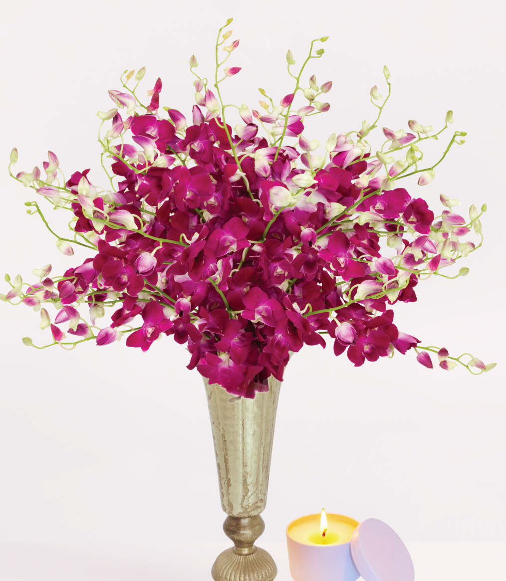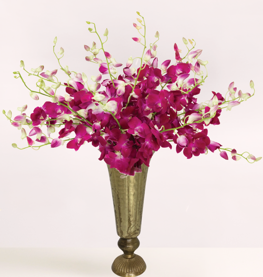 Orchids celebrate the season with vibrant pink orchids. A bouquet of twenty Sabin dendrobiums showcases a multitude of stunning petals, arranged in a beautiful 14-inch earth-toned metal vase, a testament to craftsmanship and artistry. That adds a unique modern flair, perfectly contrasting with the orchids. This sweet, sophisticated, and refreshing arrangement is ideal for any special occasion.