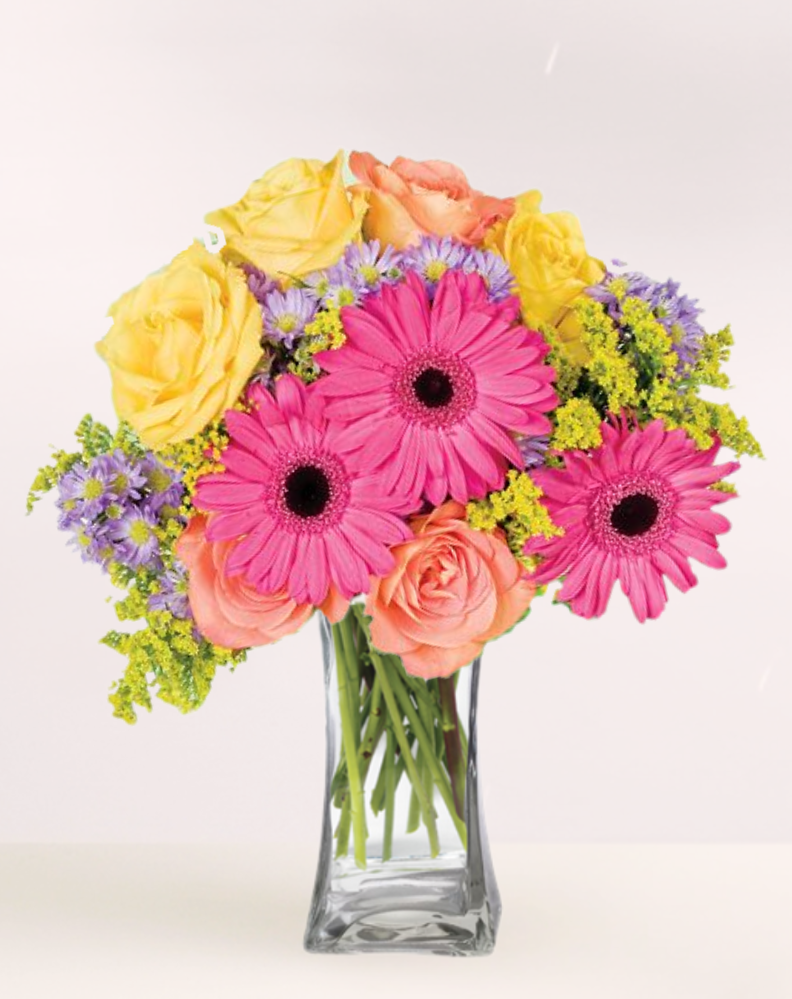 Springtime’s brightest blooms, yellow roses, hot pink Gerbera daisies, orange roses, purple asters, and yellow solidago – all arriving perfectly arranged for immediate enjoyment in our clear glass vase.