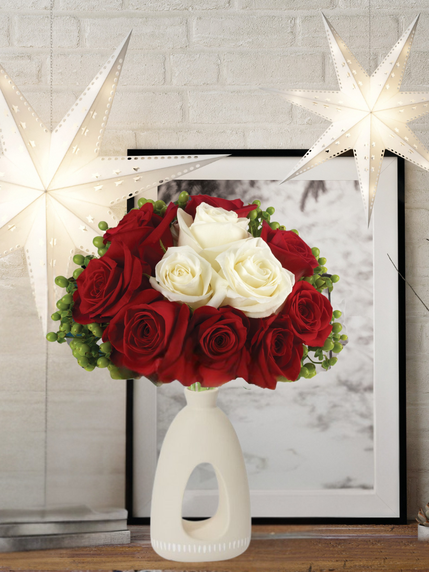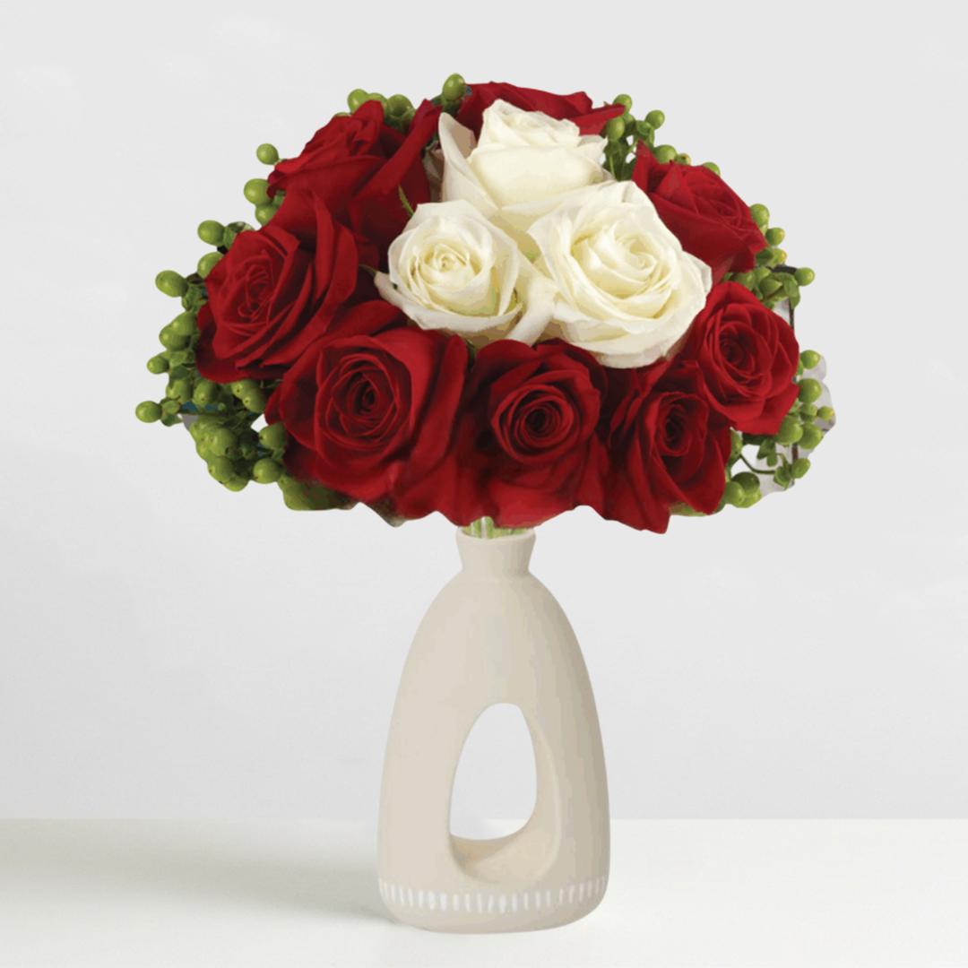 Presentation isn’t everything; but it goes a long way to make someone feel special. With a touch of European flair, snow white Blizzard roses are encircled by ruby red Freedom roses mixed with clusters of green hypericum berries to create a full display in a modern cermaic vase.