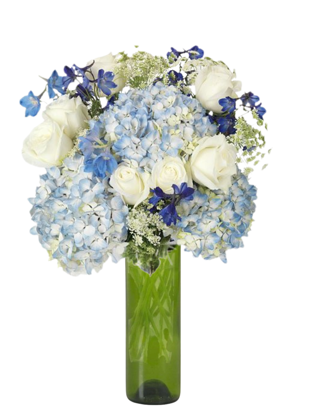 Bouwuet arrives long ste,m CUT to fit the vase height. Hydrangeas may look a bit tired upon arrival. Don’t despair! They’re healthy – cut the ends of the stems at a 45-degree angle, place 1st two inches of the stem into ” almost” boiling water for about 30 seconds, then place them in a vase filled with cool water to rehydrate. They will rehydrate and perk up within 24 hours. Remove all foliage that will fall below the water line. Roses: Remove the “guard petal” on each rose – this is the outermost petal left on to protect the bud during shipment. Also, remove any petals that may have slightly bruised during shipping. Cut stems to the appropriate length of your container or vase. Do not be afraid to cut! Always add fresh water daily.