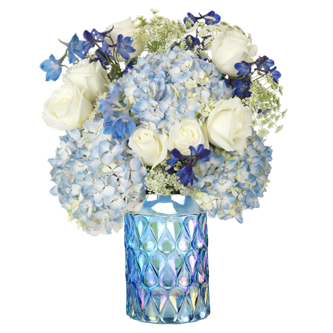 Inspired by those pristine winter days when the clear blue sky makes fresh snow sparkle and true love shine. Blue hydrangea, delphinium, Queen Anne’s lace, and roses become a wonderland inside our white ribbed ceramic pedestal vase.