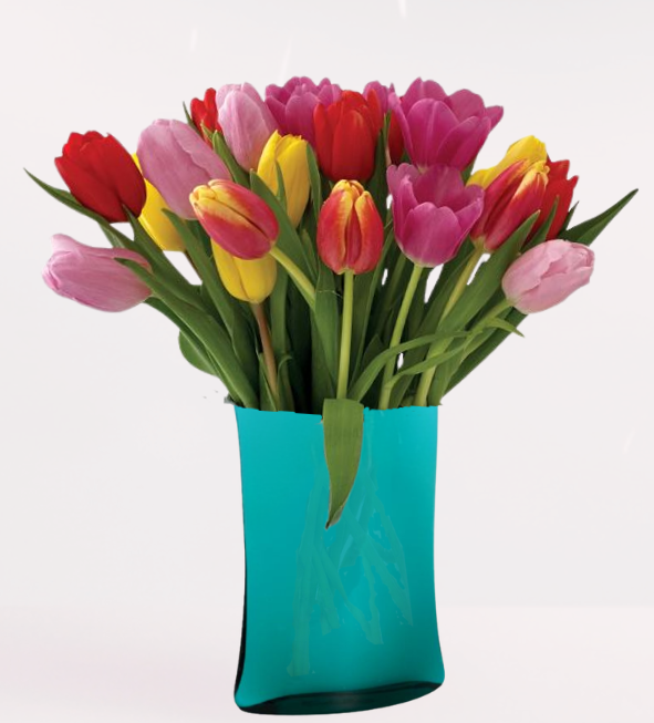 Few flowers herald the arrival of spring quite as fashionably as tulips, their colorful blooms opening wide to declare that sunshine and cheer are here. And what better place to enjoy the spring season than in the beautiful setting of someone’s home? Dutch multi-colored tulips create quite a fanfare in our colorfully displayed options of vases to announce spring’s arrival.