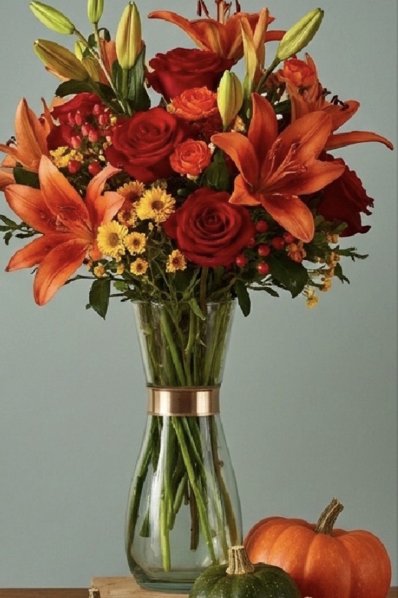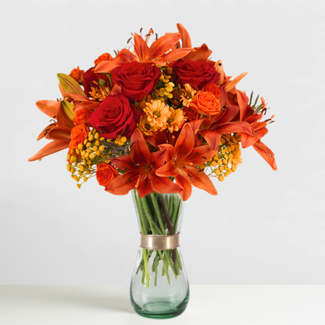 A time to come together with family and friends, Thanksgiving enticed us to create quite the gathering of our own – a unique combination of seasonal favorites blooming with style and texture. Freedom roses, Asiatic lilies (each with 3-5 blooms per stem), Jazzabell spray roses, thistle, micropoms, and chrysanthemums show off autumn’s full spectrum from our double handled ceramic vase. A natural beauty with a hint of glamour, it’s an impressive choice for your own décor or for surprising family and friends.