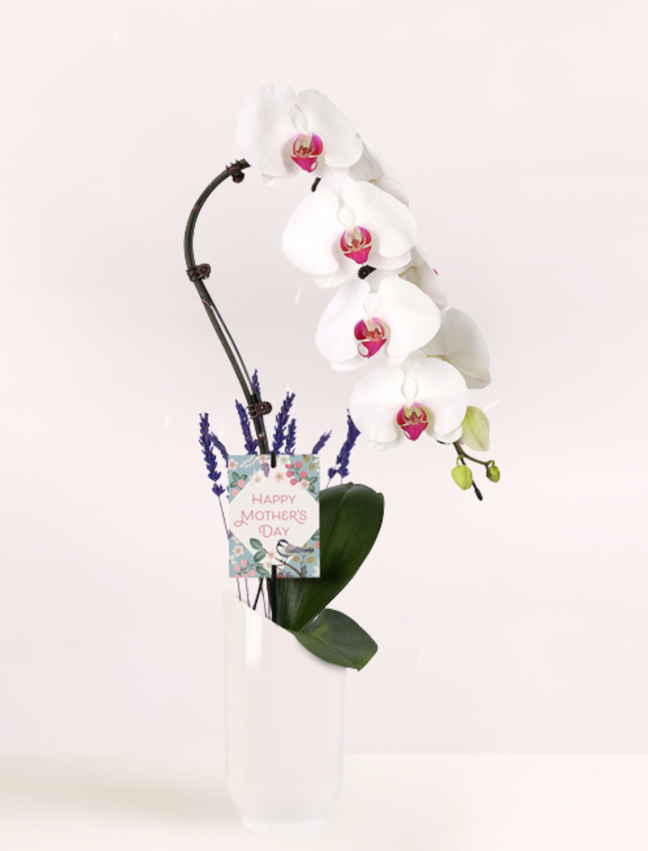 Happy Mother’s Day, and faux lavender accents our sunning orchid! Japanese lore suggests people were tending orchids up to four thousand years ago. With such an impressive history passed down through generations of growers, it’s no wonder that orchids appear so perfect. Our White Swan Orchid also known as a waterfall orchid, with silky orchid flowers in bud and bloom.